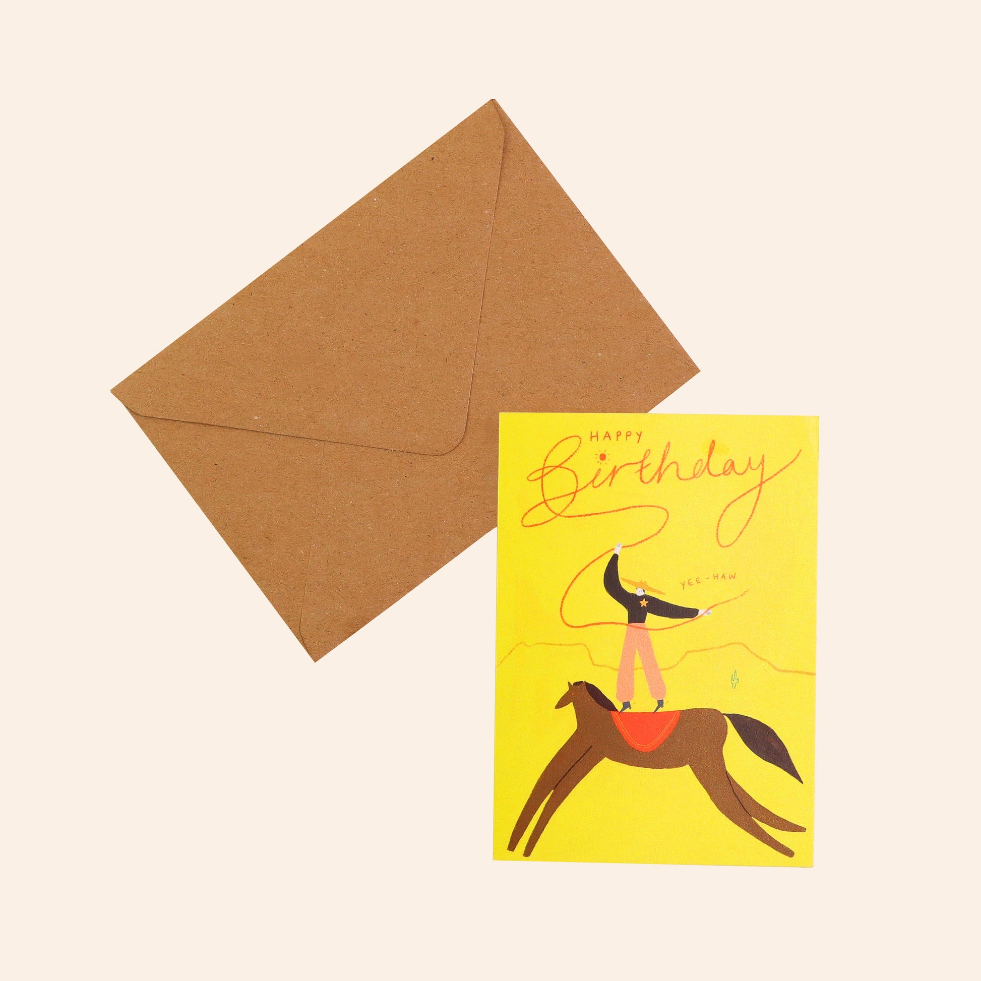 A cowboy stands atop the back of a brown horse on this birthday card, prancing across a bold yellow background underneath a lasso, which forms the ‘Happy Birthday’ caption. This ain't his first rodeo!