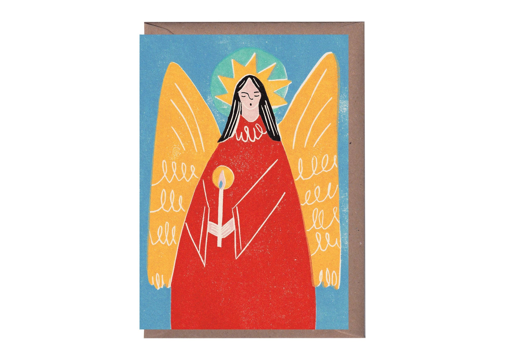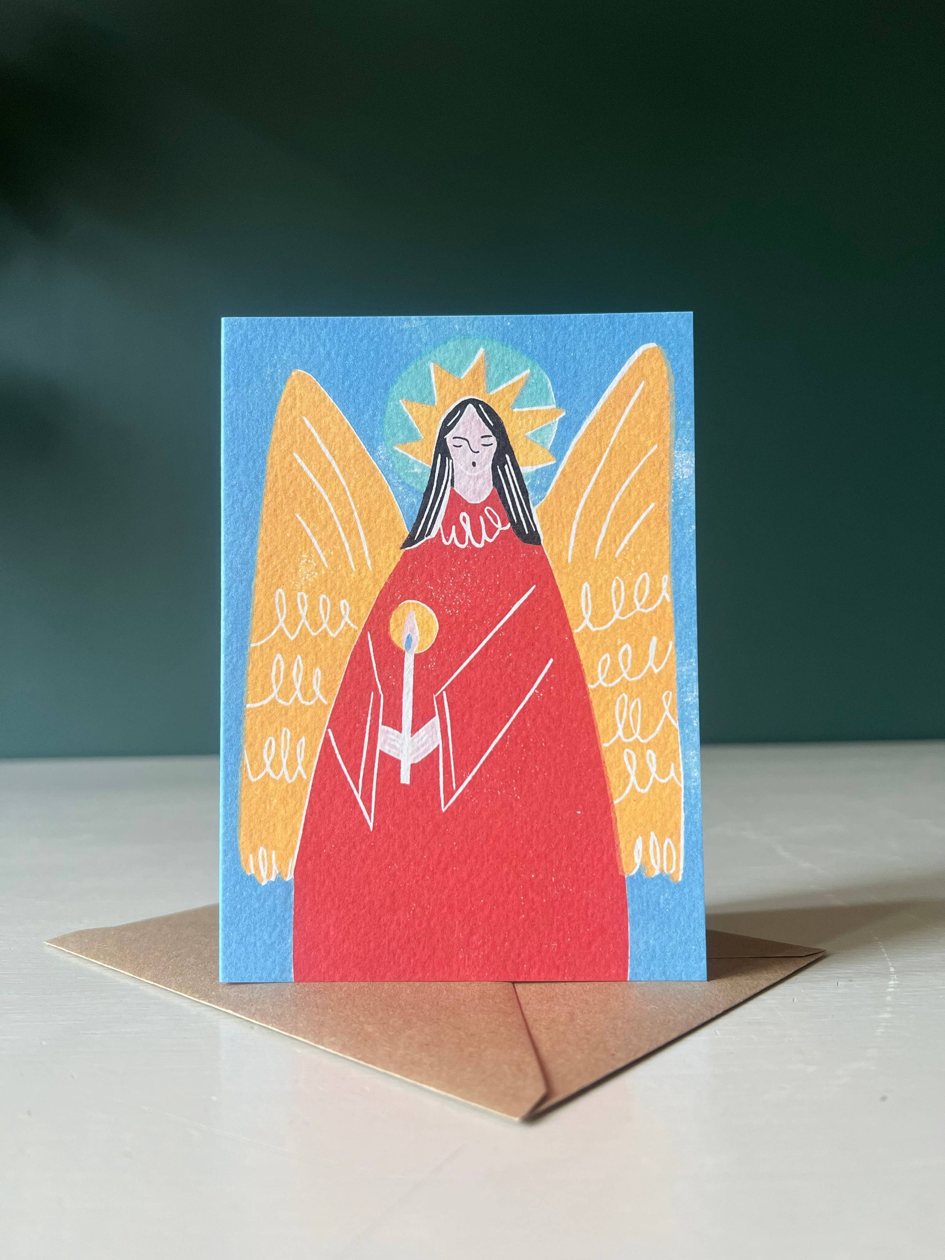 A Christmas Angel holiday greeting card. A digital print of an original linocut print designed by Luiza Holub, a UK based artist. A card perfect to give on many different occasions.